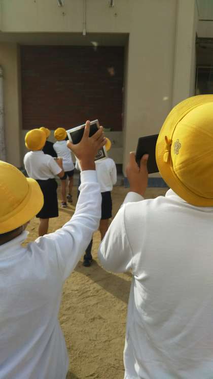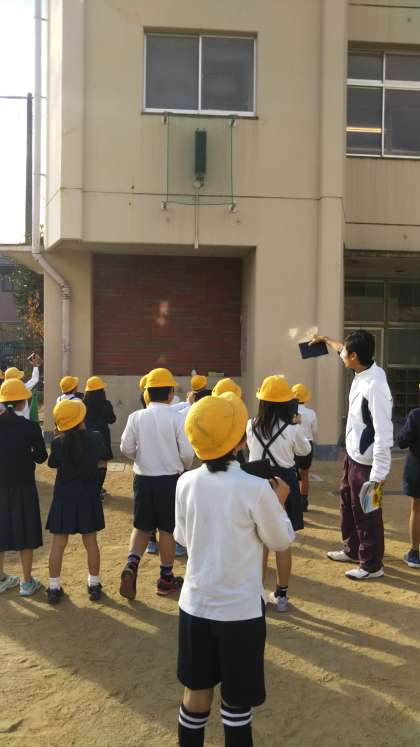 「光のせいしつ」の学習で、太陽の光を反射させて壁に映しています。「わたしの光はどれや。」「鏡の前に手を置いたら手の影が映った。」「光が薄なった」「あっ、太陽が出てきた」といろいろな発見がありました。