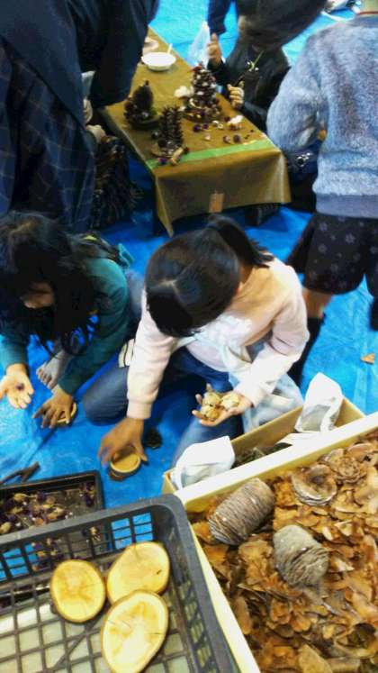 たくさんの種類の木の実、つる、輪切りの木、綿、ドライフラワー等々、盛りだくさんの材料の中から、お気に入りのものを自由に選んで創作します。子どもたちはもちろん、おうちの方々、地域の方々も楽しく過ごされています。