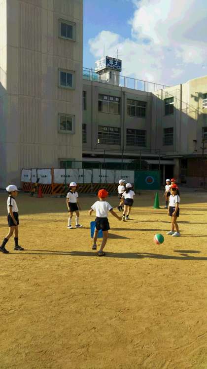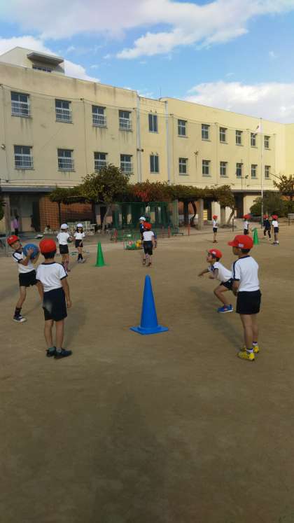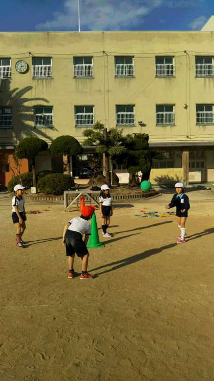 ボールをパスしながら真ん中のコーンに当てる的当てゲームをしました。しっかりボールをキャッチしてコーンをねらいました。