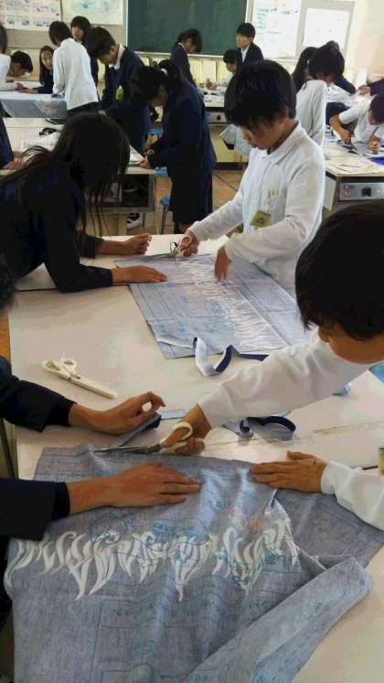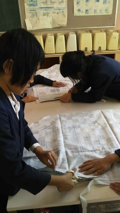 「わくわくミシン」エプロンを作ります。2人で協力して布を裁ちました。