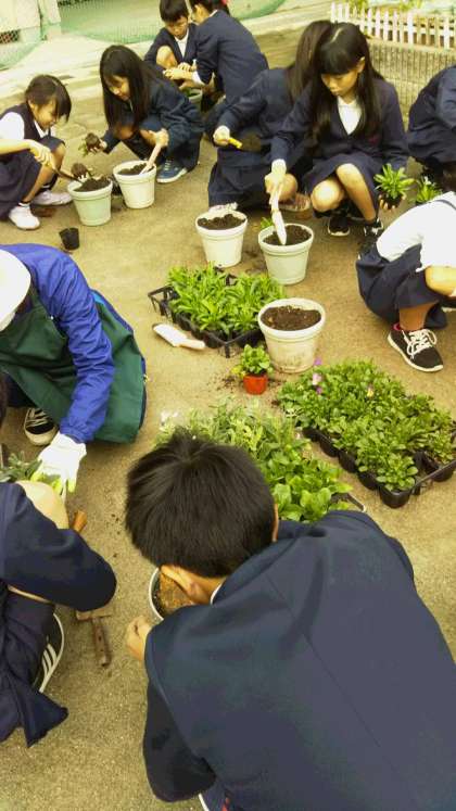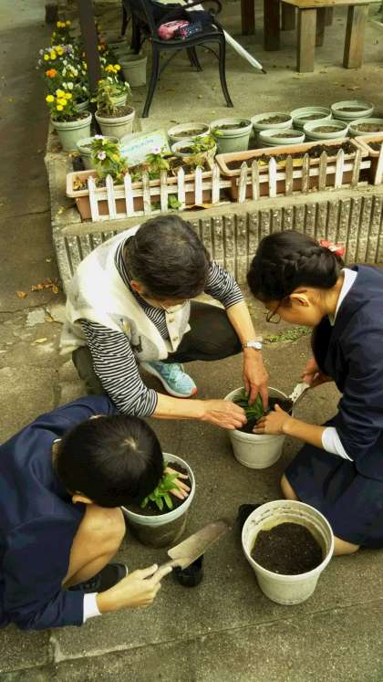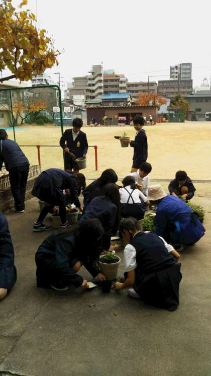 区役所の花さかすみちゃんの苗をいただき、ボランティアの方々に教えていただきながら植えました。ビオラ、ナデシコ、ストックです。これから寒くなってきますが、元気に育ってほしいです。