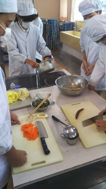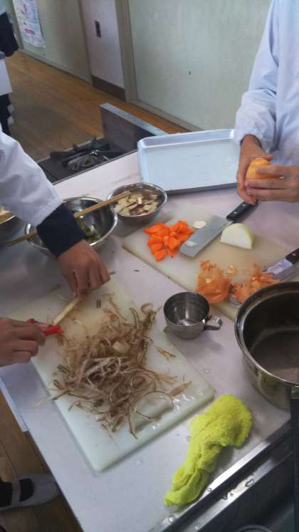 調理実習で「豚汁」と「きゅうりのあえ物」を作りました。昆布と鰹節で出汁を取り、野菜をたっぷり入れました。ささがきごぼうが長くなったり、さつまいもがなかなか切れなかったりしましたが、美味しい豚汁ができました。