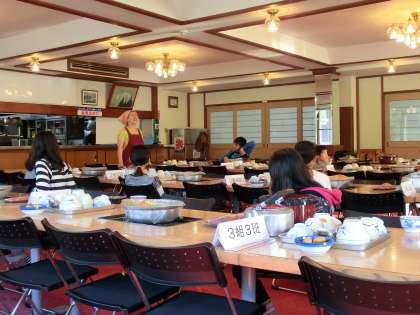 宿舎のおかみさんからすき焼きの作り方の説明を食事係りの人が、しっかりと聞いて、
