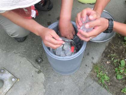 冷やす容器にアイスクリームが入れた容器を入れて、氷+塩を入れて、容器をふたをする。そして、20分間、回転させる。