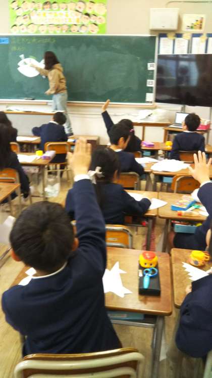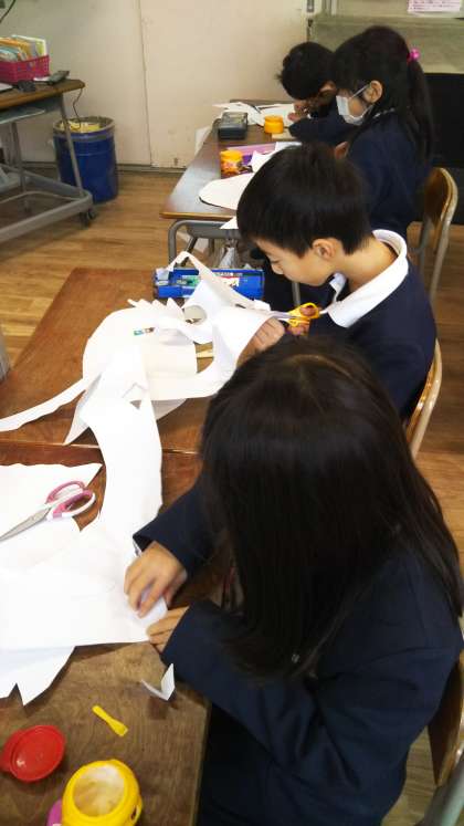 「ふしぎな魚のはんを作ろう」をめあてに紙版画をしています。魚の形、ひれ、目、鱗の模様など工夫を凝らしながら取り組みました。はさみやのりを使って丁寧に切った紙片を貼り付けました。