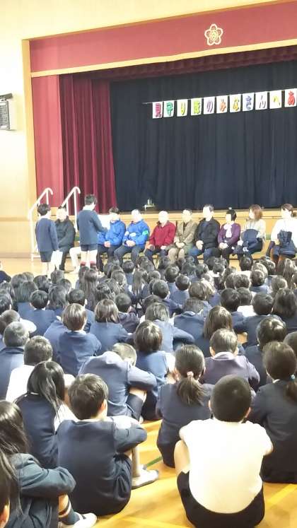 午後から「見守り隊のみなさんありがとうの会」が開催されました。全校児童で見守り隊の方々をお出迎えし、児童代表が日頃見守っていただいていることへの感謝の言葉を伝えました。見守り隊の方からは励ましの言葉をいただきました。その後、5年生と6年生の息の合った美しいハーモニーで合唱を披露しました。そして、最後は全校児童で「世界がひとつになるまで」を一生懸命、感謝の気持ちを込めて歌いました。