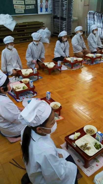 昔の道具体験をしました。昔の結婚式は、親戚などが集まって家で行われました。お膳に給食をのせて「お祝いみたい!」「新年会や。」と晴がましい雰囲気も感じ取っていました。