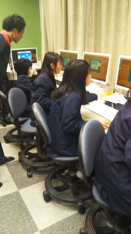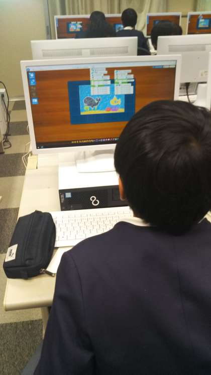 「プログラミン」というソフトを使ってプログラミング学習をしました。海の中で潜水艦やいろいろなものの動きをプログラミングしました。