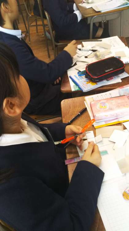 「工作用紙で立方体の箱を正しく作ろう」をめあてに試行錯誤しながら、みんなですべての展開図を見つけました。見つけられたことにみんなで感動しました。
