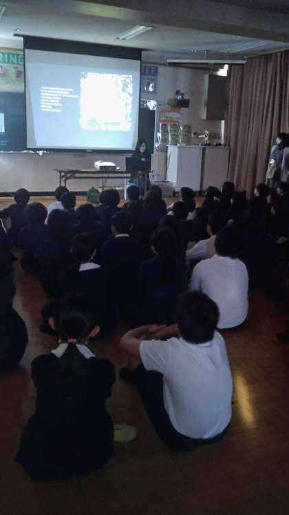 としょっぴぃさんから卒業をひかえた6年生に『えんとつ町のプペル』の読み聞かせのプレゼントがありました。周りの人たちのいじめやいやがらせを跳ね返したプペルとルビッチの友情の話です。6年生は、身動き一つせず聞き入っていました。
