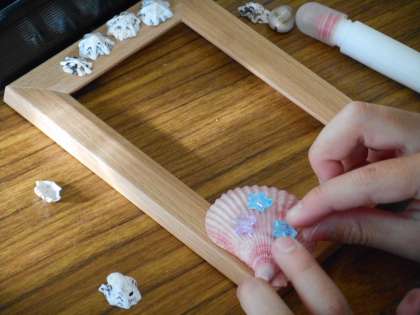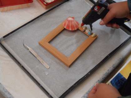 シェルクラフト体験🐚では、フォトフレームに貝やビーズ等の飾りをつけていきます。