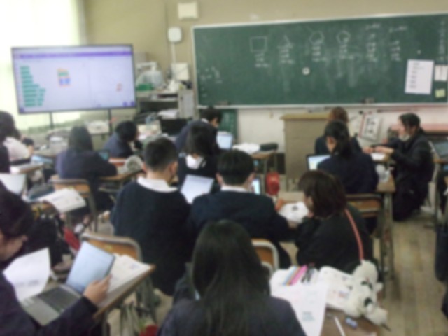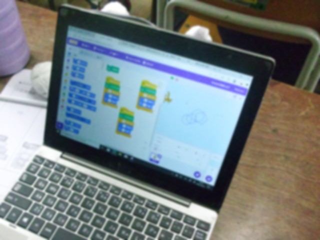 5年生の子どもたちは、スクラッチを使い、画面上のキャラクターに