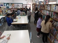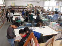 2組は、図書で、図書室で本を選び、一人で読んだり友だちと一緒に読んだりしていました。