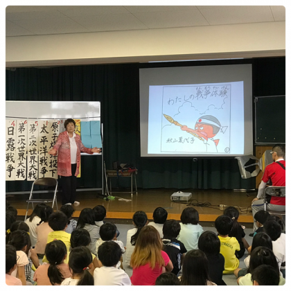 今年も秋山さんに来ていただき、戦時中の自身が疎開していたころのことや当時の空襲の恐ろしさ、食べるものがなくて、幼い弟が栄養失調で亡くなったつらい話をしてくださり、戦争の悲惨さと愚かさを伝えてくださいました。