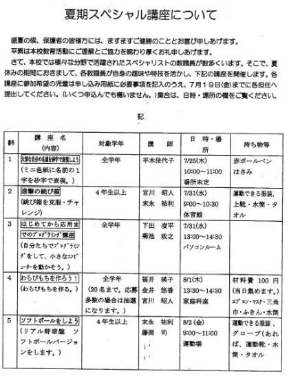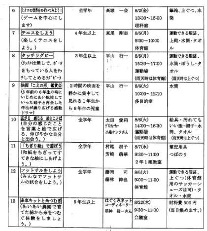 夏休みのスペシャル講座を開催します。今年度は、13講座もあり、子どもたちは、さまざまなことを体験したり楽しんだりできます。