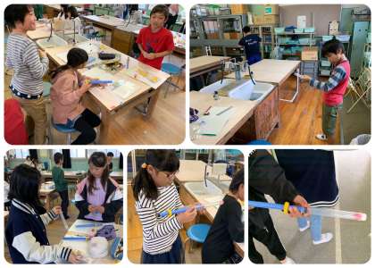 のぞいてみると、空気鉄砲の実験中。空気を押すとどうなるのか観察。