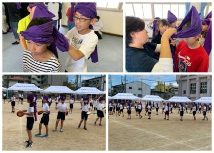 サージの巻き方を学習し、巻き合いっこ。向かい合い巻くので、心の距離が近づきます。