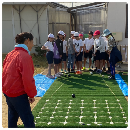 和会館グランドで、地域の人たちからニュースポーツを教えていただきました。