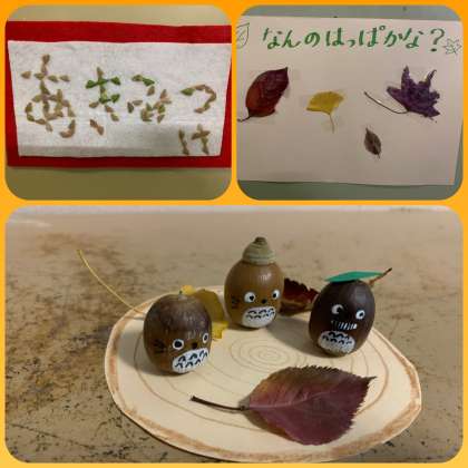 「秋、たくさんあったよ。葉っぱの色が変わったのと、どんぐり。どんぐりはまぁるいのと、シュッとしたの。楽しかったぁ」