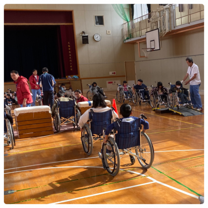 車椅子の扱い方を教わった後、実際に車椅子に乗って、スロープや段差、狭いところを通り抜けるなどの体験をしました。