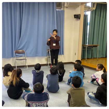 その次に、家では、手が目の代わりをして、触ることで物の形や場所がわかること。外へ出たら、白杖が目の代わりをしてくれるということ。そして、外へ出るときは命がけで、道に止めてある自転車や自動車にぶつかったり、自転車が目の前を走り抜けるとき、白杖を引っかけられて、何本も折られたこと、信号無視をしてわたる子どもたちの声につられて、赤信号と分からずにわたり、危ない目にあったことなどを話してくださいました。