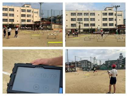 タブレットを使ってタイムを計測したり、フォームのチェックをしながらハードルの練習をしています。