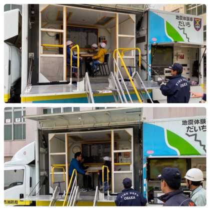 初めて、起震車に来てもらい、全児童が地震の揺れを体験しました。高学年や先生も震度7の揺れを体験しました。