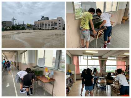 運動場は使えず「あ〜ぁ。」「遊びたかったのに。」とがっかりしている子どもたちの声がたくさん聞こえてきましたが、メダカの観察をしたり、教室の中で思い思いに過ごす雨の日の5年生でした。