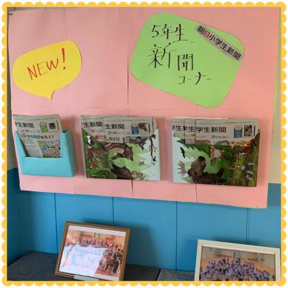 5年生前の廊下には、これまで、新聞に興味を持ってもらおうと気になる記事の紹介をしてきました。