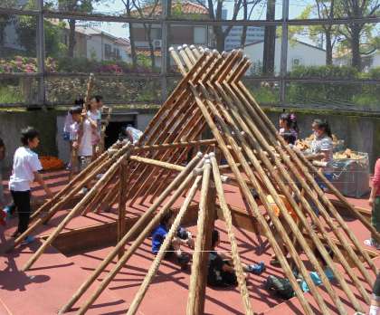 当時の生活の様子を学ぶために、子どもたちはみんなで協力して「竪穴式住居」を作りました。