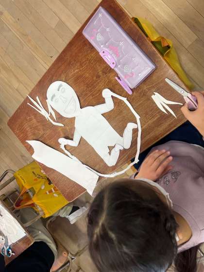 休業中に描いたデザインをもとに、自分が縄跳びをしているところを版画にします。