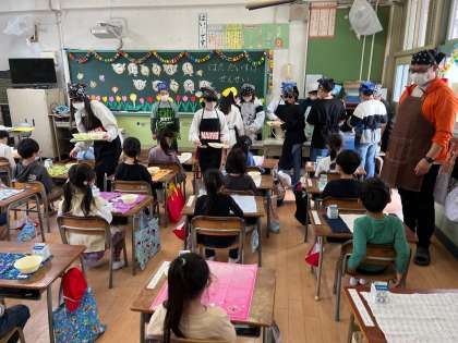 最初は、6年生が配膳の見本を見せてくれます。さすが6年生、とても手際良く配膳してくれました。