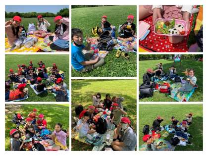 大芝生広場で、おうちの人が作ってくれたご飯をいただきました。