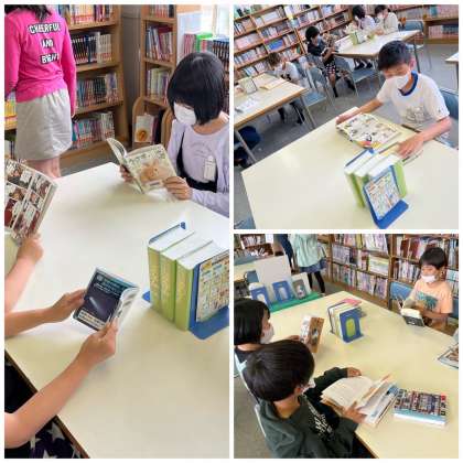 5年生では図書室で1時間、本を読みました。それぞれが興味のある本を集中して読みました。場所が分からなかったりした場合は図書館司書に聞いて教えてもらっていました。