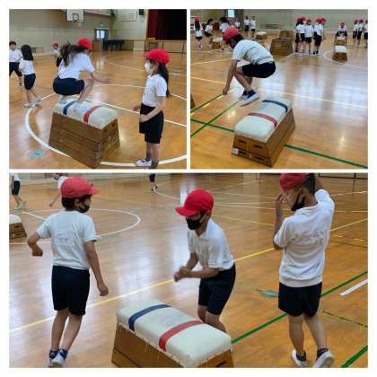 自分に合った高さの跳び箱を選び、みんなが汗だくになりながら、音楽のリズムに合わせて跳びました。