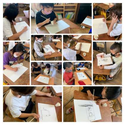 グループに分かれ、グループごとに同じものを違う角度から見て描く学習です。