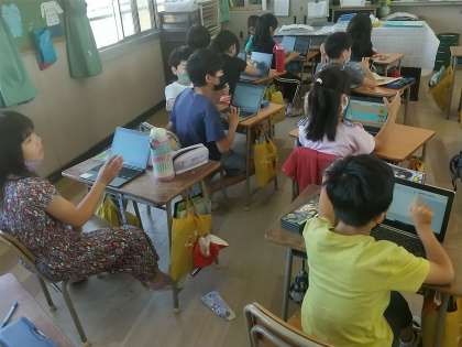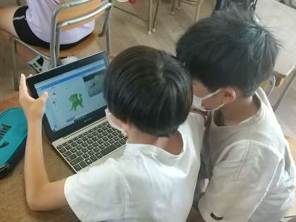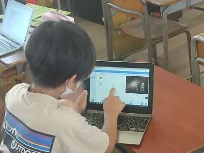 「Scratch」でプログラミングをしています。回転できるようになりました。操作するキャラクターを「ペイント」で描いています。