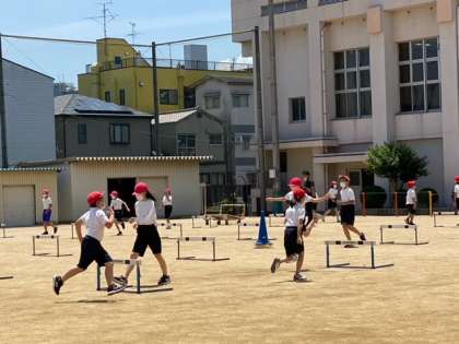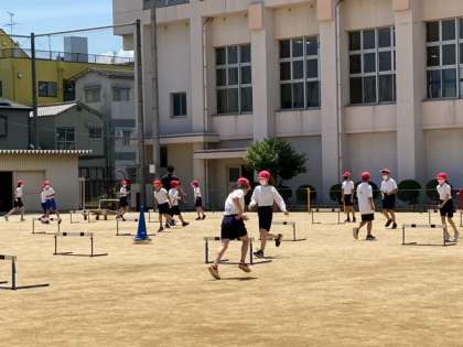 5年生では体育でハードル走に取り組んでいます。今日は跳ぶのではなく「越える」を意識して取り組みました。汗をたくさんかきながら一生懸命走りました。