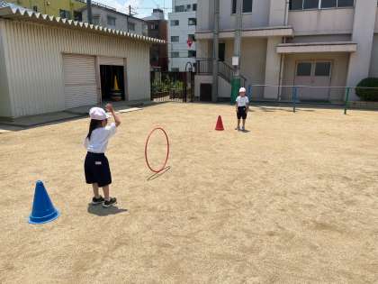 今日はペアで転がしたり、わっかくぐりをしてみたり、フラフープでリレーをしました。