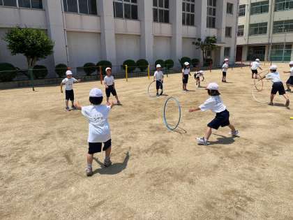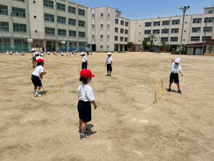 1年生は、3時間目に体育でフラフープ遊びをしました。