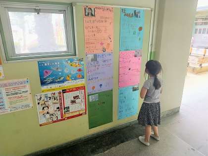 新聞委員会が取材してまとめた新しく山之内小学校に来られた先生方の紹介が1階職員室前に掲示されています。