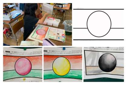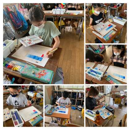 まずは、青や赤にほんの少しずつ白を混ぜ、うすくなっていくグラデーションを学びました。
