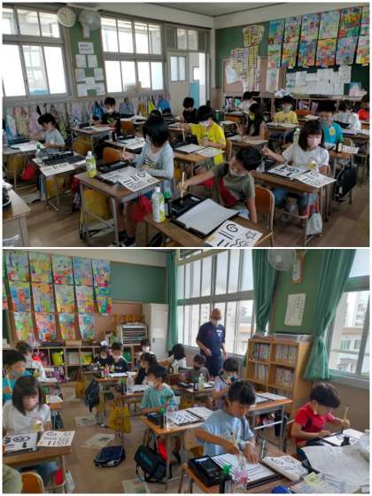 子どもたちは、緊張しながらも楽しんで筆で線や絵をかきました。