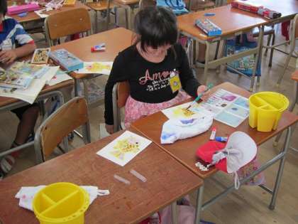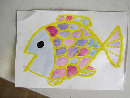 図画工作科の学習では、絵の具とクレパスを使って「魚」を描いています。