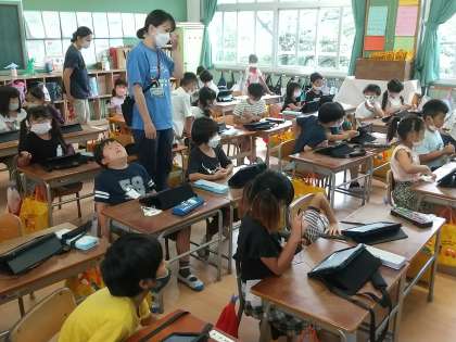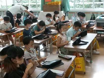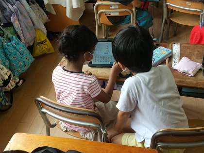 低スペックのタブレット端末に悪戦苦闘しながらTeamsに入っています。アルファベットも漢字も習っていないのに、コードの打ち込みは慣れています。