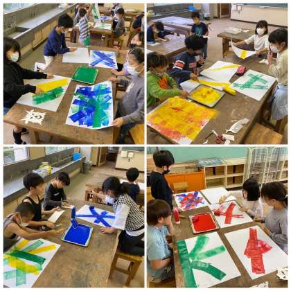 図画工作化では、暴れりゅうに取り組んでいます。発色を楽しみながら、和紙にローラーを使って色を塗っています。
