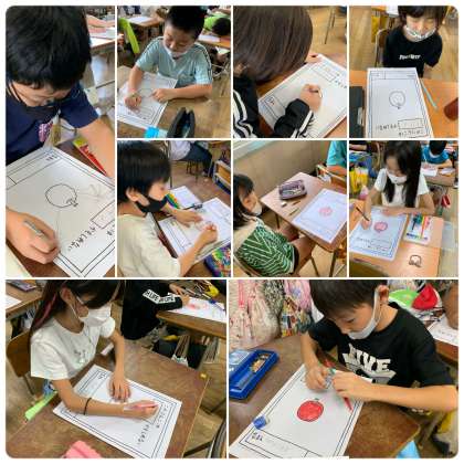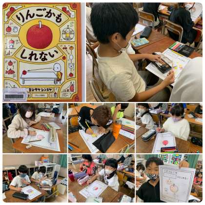 そこで、4年生はヨシタケシンスケさんの『りんごかもしれない』を読み、絵本についていた「自分の『りんごかもしれない』」にチャレンジしました。