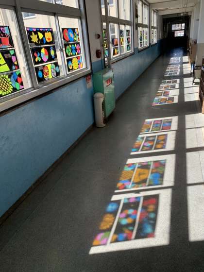4年生がつくった「ステンドグラス」が窓一杯に貼られ、そして、カラフルな色をつくってくれています。