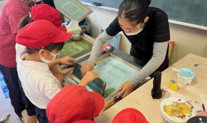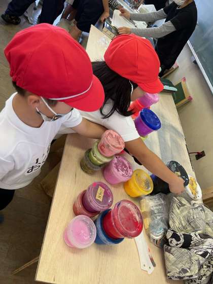 1年生は図工で、みんなでデザインした絵柄をもとに、シルクスクリーンという技法でTシャツを作りました!
