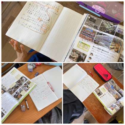 今日の社会は、ノートにスーパーの工夫を書くという学習をしました。